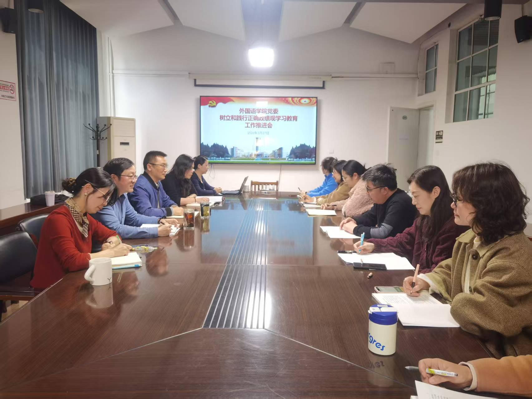 为深入贯彻落实习近平总书记关于树立和践行正确政绩观的重要论述精神,扎实推进“十五五”开局之年各项工作,3月27日,外国语学院党委在品学楼2301会议室召开树立和践行正确政绩观学习教育工作推进会。学院党委书记李炜主持会议并讲话,学院党政领导班子成员、各党支部书记、科级干部参加会议。李炜对学院前一阶段树立和践行正确政绩观学习教育开展情况进行了总结回顾。他说,自学院召开动员部署会以来,学院党委理论学习中心组、各党支部迅速行动,通过“三会一课”、主题党日、专题研讨等形式,组织党员干部深入学习习近平总书记关于树立和践行正确政绩观的重要论述,特别是习近平总书记在参加十四届全国人大四次会议江苏代表团审议时的重要讲话精神,全院上下形成了学思践悟、知行合一的良好氛围。