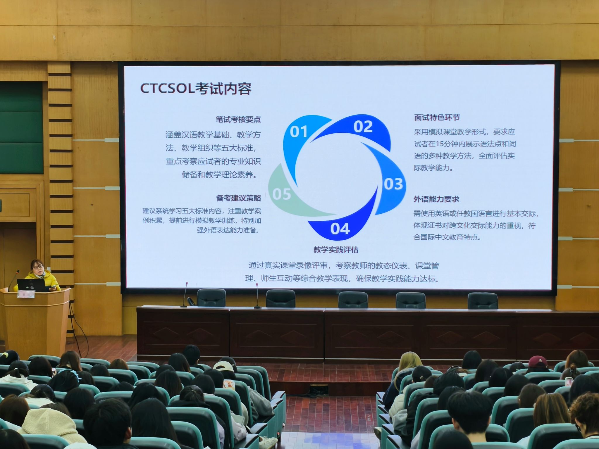 葛红教授围绕微专业核心内容进行详细解读。她介绍,该微专业于2024年正式启动,面向全校学生免费开放,完成课程考核可认定4个创新创业实践学分。课程对标CTCSOL国际中文教师证书考核标准,由持证骨干教师授课,兼顾理论教学与实践实训。葛红表示,当前全球“中文热”持续升温,国际中文教育领域国内外就业前景广阔,学院将持续完善校友联动机制与实践平台,助力学生实现高质量发展。