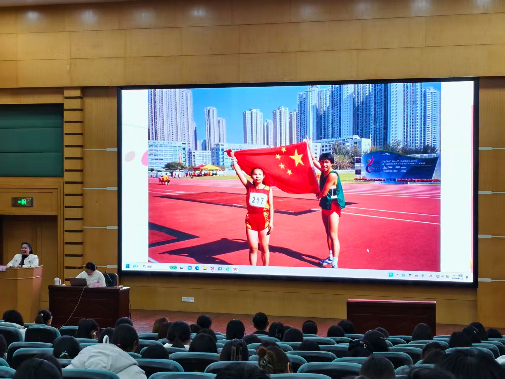 活动现场,吴晶结合自身成长经历,向同学们讲述了她与命运抗争、逐梦前行的故事。吴晶幼年时因病失去光明,人生起点与常人截然不同,却始终保持着对世界的好奇与直面困境的勇气。在家人的鼓励下,她克服重重障碍,考入瑞典顶尖音乐学院,精通多门语言,登上维也纳金色大厅等国际舞台,用音乐传递温暖与力量;同时刻苦训练田径,斩获多项赛事金牌,征战雅典残奥会,用拼搏诠释永不言弃的体育精神。分享中,她还通过视频展示了盲人借助科技工具学习、出行的场景,让同学们直观感受到无障碍建设带来的便利,也传递了对包容平等的呼吁。